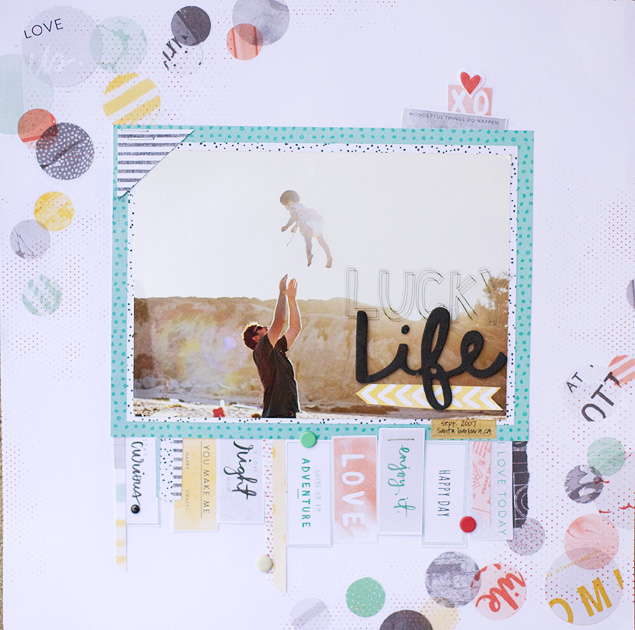 Funny sidenote, I made these layouts weeks apart, and when photographing them at the same time, I noticed I tucked in the phrase, wonderful things do happen, to both tops of the photos. Apparantly that's my go to move and my go to phrase. Oh well, different pages will be in each girl's books. Done! I also can't believe I've been holding on to that photo of Elsie since she was 18 months old. She's 8 now. WHAT!?