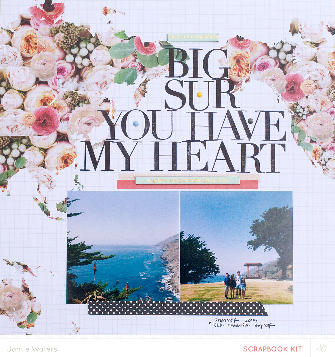 Studio Calico's September Kits are available now! This month is called Brimfield. I have to say, that the process of creating each month again has been a fun experience. There have been times where I've been stumped, where there were colors or patterns that I thought weren't 'me'. When I've designed for 2peas waaaay back in the day, there was pretty much free reign and you could create whatever you wanted. Designing for a kit club where they choose your supplies/ingredients has been surprising and a good creative stretch for me. This month felt so good though. Every paper and color were 'me'. I didn't have to overthink anything. Things just meshed. This layout took me about 5 minutes. All I did was stamp the title and glue everything else down. That's my kinda creating. Capturing our memories and recording them on pretty paper. That's my motto. :)
