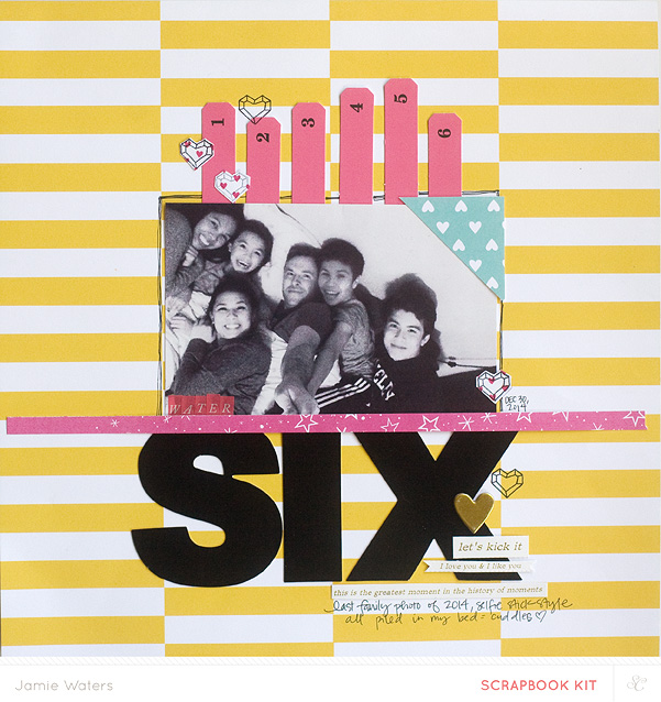 So many cute patterned papers, I may have gotten carried away with the mixing on a few of them. π I'm just happy I have a layout with my whole family represented!